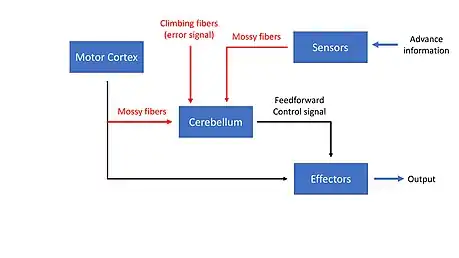 If you were to understand the exact workings of each and every neuron in the cerebellum, you would certainly receive the Nobel Prize right away. As with all brain-related control systems, we need to zoom out and look at a slightly higher level of abstraction. The cerebellum is home to two special types of neurons, namely the Purkinje cells and the deep cerebellar nuclear cells, which are essentially our sensors in the control system sense and are fed with sensory information via mossy fibers and climbing fibers. Mossy fibers mostly transmit the information about the desired output, whilst climbing fibers are specialized to transfer sensory information about the current state of the system as well as already processed error signals.