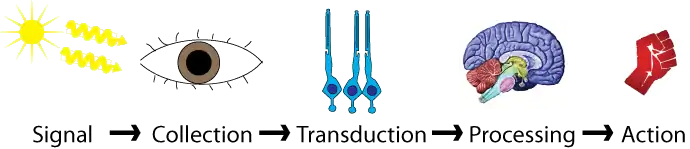 The role of our "senses" is to transduce relevant information from the world surrounding us into a type of signal that is understood by the next cells receiving that signal: the "Nervous System". (The sensory system is often regarded as part of the nervous system. Here I will try to keep these two apart, with the expression Sensory System referring to the stimulus transduction, and the Nervous System referring to the subsequent signal processing.)