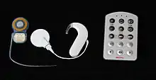 The implant is surgically placed under the skin behind the ear. The basic parts of the device include: