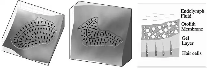 it is therefore sometimes referred to as gravito-inertial force. The mechanism of transduction works roughly as follows: The otoconia, calcium carbonate crystals in the top layer of the otoconia membrane, have a higher specific density than the surrounding materials. Thus a linear acceleration leads to a displacement of the otoconia layer relative to the connective tissue. The displacement is sensed by the hair cells. The bending of the hairs then polarizes the cell and induces afferent excitation or inhibition.