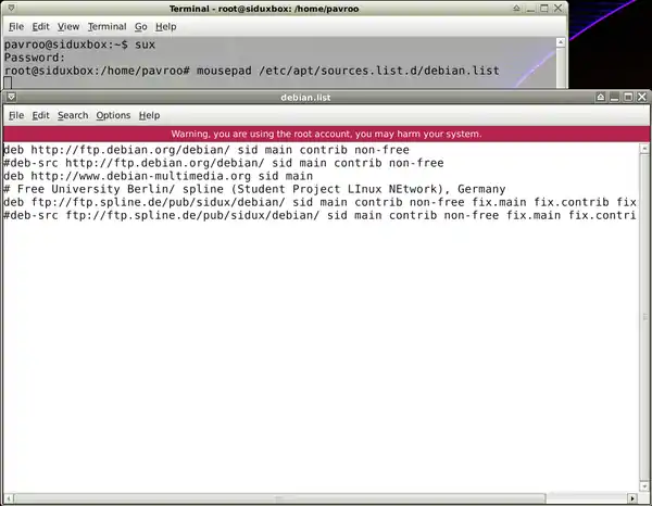 sux root password mousepad /apt/etc/sources.list.d/debian.list and mousepad /apt/etc/sources.list.d/sidux.list