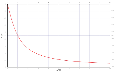 Find the frequency response function, and hence the amplitude and phase response functions, of the following RC circuit (it is already in phasor form):