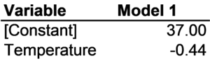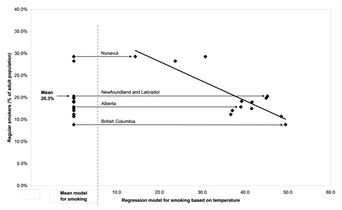 The mean model is a very simple approach to understanding smoking rates. It says something about smoking rates -- that they're not 0% or 50% -- but doesn't say anything about why smoking rates differ from province to province. All the variability in smoking rates across provinces is considered to be error in the model. A regression model might help explain some of the differences in smoking rates across Canada's 13 provinces and territories. One theory of the differences in smoking rates might be that smoking rates depend on the weather. Canada is cold. The mean annual temperature across the capital cities of Canada's 13 provinces and territories is less 38 degrees Fahrenheit. This is much colder than New York (57 degrees), Chicago (51 degrees), or Los Angeles (66 degrees). Even Minneapolis (average annual temperature 45 degrees) and Fargo (41 degrees) are warmer than most of Canada. One theory might be that some people smoke because they get bored when they can't go out in the cold weather. A specific hypothesis based on this theory would be that smoking rates rise as the average temperature falls. The results of a regression model using average annual temperature as the independent variable and the smoking rate as the dependent variable are presented in Figure 4-9.