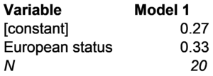 An interesting pattern in ODA spending that is made clear by Figure 4-2 is that all of the most generous countries are European. We might generalize from this observation to hypothesize that European country status is an important determinant of ODA spending levels. The results of a regression of ODA spending on European country status are reported in Figure 4-3. The intercept is 0.27, which is the expected value of ODA spending when European status = 0. In other words, rich non-European countries tend to give about 0.27% of their national incomes. The regression coefficients in Figure 4-3 can also be used to calculate the expected value of ODA spending for European countries. For European countries, European status = 1, so ODA spending = 0.27 + 0.33 x 1 = 0.60% of national income. This expected value could be used to predict ODA spending in a rich European country that was not included in the database, like Liechtenstein. Based on the regression reported in Figure 4-3 the predicted value of ODA spending for Liechtenstein would be 0.60% of national income. Since Liechtenstein is a European country (European status = 1), this prediction would be an interpolation, not an extrapolation.