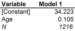 In the mean model, each person in Taiwan is modeled as having a score of 38.8, plus or minus some deviation or error. This error is known as model error. It doesn't necessarily mean that there was a mistake in measuring someone's democracy rating. It means that the model gave an expected rating -- 38.8 -- that for many people was in error. Most people don't have a democracy rating of exactly 38.8. They have scores that are either lower or higher. These lower and higher scores average out to an observed mean of 38.8 points. The goal of the mean model summarized in Figure 5-6 is to find the true mean of how people in Taiwan feel about democracy. We don't know the true mean, but we do know that the observed mean is 38.8 on a scale from 0 to 100. The observed mean might differ from the true mean due to error. Broadly speaking, there are three different types of model error in a mean model: Measurement error Sampling error Case-specific error Measurement error is error resulting from accidents, mistakes, or misunderstandings in the measurement of a variable. For example, a respondent might mark the wrong oval on a survey form, or a question might be badly worded. Respondents might not remember the answer to a question, or might misunderstand the question. In a telephone survey, the researcher might not hear the respondent correctly, or might type in the wrong answer. Accidents happen. Since the observed mean democracy rating is calculated from people's actual answers as recorded on the survey, it might differ from the true mean if these recorded answers are wrong. Sampling error is error resulting from the random chance of which research subjects are included in a sample. Taiwan today is home to 22.8 million people. Only 1216 of them were included in the survey. It is possible that these 1216 people are not truly representative of the Taiwanese population. Every person's rating of democracy in Taiwan is the result of millions of influences and experiences. Ideally, all of these typically Taiwanese experiences should be reflected in the people chosen for the survey. If the sum total of all these influences experienced by the people answering the survey differ from the sum total of the influences experienced by the population as a whole, the observed mean from the survey will differ from the true mean of the population as a whole. For example, the survey design might not include sampling for hospitalized or homeless people, and so their experiences would not be reflected in the observed mean. Case-specific error is error resulting from any of the millions of influences and experiences that may cause a specific case to have a value that is different from its expected value. Most of the error in any statistical model is case-specific error. Each person's unique experience of the world determines that person's views on subjects like democracy. Since everyone has a different experience of the world, everyone differs from the mean for different reasons and in different ways. People with different identities, backgrounds, or even moods the day the question is asked will give different answers. Since these characteristics of people are always changing, the observed mean at any one time may differ from the true mean of the research subjects in the study. Case-specific error is so large because every person's answer to any question represents a kind of a random sample of all the potential influences that can possibly be experienced in a society. In the mean model, the results of all of these different and unique experiences are lumped together into a the model error. Linear regression models, on the other hand, take some of those unique experiences and bring them into the model. The independent variable in a regression model represents some part of what makes each case unique. For example, one thing that shapes people's views on democracy is their age. Older Taiwanese people grew up under a military dictatorship. We might theorize that people who grew up under a military dictatorship would be thankful for any kind of democracy. One hypothesis based on this theory would be that older people would rate Taiwan's democracy more highly than younger people. The results of a linear regression model using age as the independent variable and democracy rating as the dependent variable are reported in Figure 5-7.