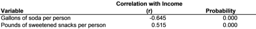 Standardized coefficients from simple linear regression models are often used in this way to gage the strengths of the relationships between variables. Standardized coefficients are a convenient shorthand for the relationship between two variables for several reasons. First, since they are based on standardized variables, they are always comparable, no matter what units the original variables were measured in. Second, it turns out that in simple linear regression models with one predictor, it doesn't matter which variable is the dependent variable and which is the independent variable. Either way the standardized coefficient will be the same. Third, again only in simple linear regression models with one predictor, it turns out that the standardized coefficient will always fall somewhere between -1 and +1. The slope is never larger than 1 in either direction. This use of standardized coefficients from simple regression models is so common that it has its own name and symbol: correlation, denoted using the symbol "r." Correlation (r) is a measure of the strength of the relationship between two variables that runs from r = -1 (perfect negative correlation) through r = 0 (no correlation) to r = +1 (perfect positive correlation). The correlation between two variables is exactly the same thing as the standardized coefficient from a regression of one of the variables on the other variable. Figure 8-10 demonstrates how the correlations of state income with soda and sweetened snacks might be compared. Notice how the correlation coefficients are identical to the simple linear regression coefficients reported in Figure 8-8 and Figure 8-9. Similarly, their probabilities correspond to those from the t statistics reported in Figure 8-8 and Figure 8-9.