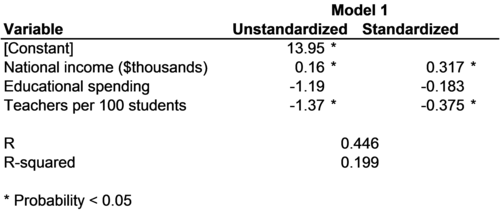 8.3. R and R2 In addition to gaging the strengths of the relationships between variables in general, correlations have another, very specific use. Correlations can be used to evaluate the overall predictive strength of any regression model. For example, the table in Figure 8-11 repeats the results of the regression of the gender gap in science scores on three independent variables (national income, educational spending, and number of teachers) from Figure 7-6. In Figure 8-11 both unstandardized and standardized coefficients are reported. The standardized coefficients indicate that the effects of teachers and national income are stronger than the effects of educational spending, but they don't tell us how well the model as a whole does in predicting the gender gap in science.