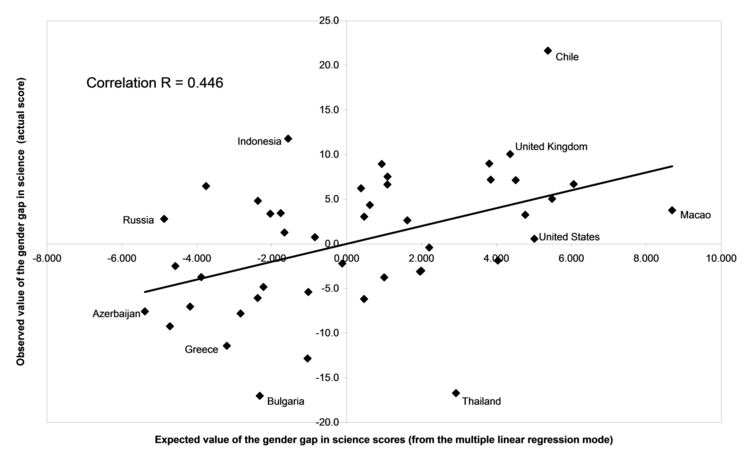 Correlations can be used to help shed light on this. The key question in evaluating the performance of a model is: how well do the values of the dependent variable predicted by the model correspond to the actually observed values of the dependent variable? In other words, what is the strength of the relationship between the dependent variable's expected values and its actual values? A correlation is ideal for measuring the strength of the relationship between two variables. When the two variables being correlated are the actual and expected values of a dependent variable from a regression model, the correlation is represented by the capital letter R (to distinguish it as a specific type of correlation). For Model 1 of Figure 8-11, R is 0.446. This means that in Model 1 of Figure 8-11 the actual values of the gender gap in science are correlated r = 0.446 with the expected values generated by the regression model. This is not ideal (a perfect correlation would be r = 1), but it's something. Figure 8-12 plots the actual values of the gender gap in science scores against the expected values generated by Model 1 of Figure 8-11. There is a definite positive relationship between the two, but it is not very strong. By way of comparison, for the regression predicting smoking rates across Canadian provinces (Figure 8-6) the model's predictive performance was R = 0.928, while for the regression predicting CO2 emissions across countries (Model 3 of Figure 8-7) the model's predictive performance was R = 0.632. The regression model in Figure 8-11 does predict the gender gap in science scores, but not especially well.