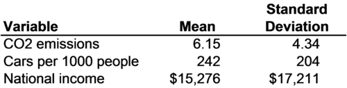 8.1. Comparing like with like using standardized variables Linear regression involves comparing the values of variables that mean very different things. In Model 2 of Figure 8-1 it is reported that every 1 additional passenger car per 1000 people in a country is associated with an increase of 0.008 tons of CO2 emissions per person, while every $1000 in national income is associated with an increase of 0.074 tons of CO2 emissions. The variable passenger cars is expressed as a number per 1000 people, the variable national income is expressed in thousands of dollars, and the variable CO2 emissions is expressed as tons per person per year. The use of so many different units makes it hard to compare countries across different variables. For example, Australia has 542 cars per 1000 people, a national income of $29,480 per person, and CO2 emissions of 18.1 tons per person. Are these figures high, low, or about average? How do they compare to each other, and to other countries? One way to judge whether a value of a variable is high or low is by using means and standard deviations. Figure 8-2 reports the means and standard deviations of CO2 emissions, passenger cars, and national income for the 51 countries used in Figure 8-1. Australia's CO2 emissions (18.1 tons) are well above the mean level for CO2 emissions across the 51 countries. In fact, Australia's CO2 emissions are more than 2 standard deviations above the mean. The mean is 6.15 tons. The mean plus one standard deviation is 6.15 + 4.34 = 10.49 tons. The mean plus two standard deviations is 6.15 + 4.34 + 4.34 = 14.83 tons. Australia, with emissions of 18.1 tons, is far above this level.
