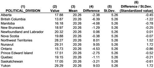 Normally, standardization is performed automatically by statistical computer software, but the steps in the process of standardization are illustrated in Figure 8-4 for the variable "heavy drinking." All 13 Canadian provinces and territories are listed in Column 1 and their heavy drinking rates are reported in Column 2. The mean value of heavy drinking is recorded in Column 3. The difference between each value and the mean is calculated in Column 4. The standard deviation of heavy drinking is recorded in Column 5. The standardized value of heavy drinking for each province is calculated in Column 6. The values in Column 6 represent how many standard deviations each province is from the mean level of heavy drinking for all provinces.