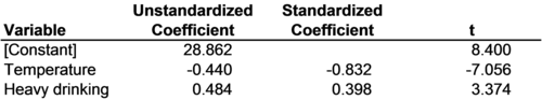 The coefficients of a multiple linear regression model regressing the provincial smoking rates on average temperatures and heavy drinking rates are reported in Figure 8-6. Two sets of coefficients are reported, one set using the unstandardized variables and one using the standardized variables. Unstandardized coefficients are the coefficients of regression models that have been estimated using original unstandardized variables. Standardized coefficients are the coefficients of regression models that have been estimated using standardized variables. The unstandardized coefficients are just the regular coefficients found using the three variables in their original units. They are the same as the coefficients that were reported in Figure 7-13, Model 2. The standardized coefficients, on the other hand, are the coefficients of the model that result when the new, standardized versions of the variables are used.