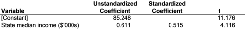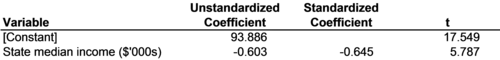 8.2. Correlation In Figure 8-6 and Figure 8-7, standardized coefficients are used to compare the relative strengths of relationships within a model. The relationship between temperature and the smoking rate is much stronger than the relationship between heavy drinking and the smoking rate across Canadian provinces. The relationship between passenger cars and CO2 emissions is roughly the same strength as the relationship between national income and CO2 emissions across countries. In each of these cases, the strengths of different relationships are compared within a single regression model. Standardized coefficients can also be used to compare the strengths of relationships across models. For example, in Chapter 1 it was theorized that low incomes led to higher junk food consumption. This theory was operationalized into two specific hypotheses. First, it was hypothesized that US states with higher median incomes would have less soda consumption. Second, it was hypothesized that states with higher incomes would have less sweetened snack consumption. It turned out that the first hypothesis was correct, but the second was wrong. Contrary to expectations, states with higher incomes actually had more sweetened snack consumption, not less. We might want to know which relationship was stronger, the (expected) relationship between income and soda or the (unexpected) relationship between income and sweetened snacks. The results of regressions of each dependent variable on state median income are reported in Figure 8-8 and Figure 8-9. The unstandardized coefficients in each model are the same coefficients as were reported in Chapter 1. The unstandardized coefficients indicate that each additional $1000 in state median income is associated with a 0.603 gallon decline in soda consumption per person per year and a 0.611 pound increase in sweetened snack consumption per person per year. The standardized coefficients indicate that the strength of the relationship between income and soda consumptions is actually slightly stronger than the strength of the relationship between income and sweetened snack consumption.