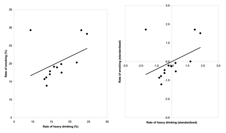 Standardization changes the value of each case in a variable into a standardized value, but it does not change the distribution of a variable in any way. High cases are still high cases and low cases are still low cases. It's only the units that change. This is illustrated in Figure 8-5. The left side of Figure 8-5 is a scatter plot of smoking rates versus heavy drinking rates for the 13 Canadian provinces and territories using the original, unstandardized variables. The right side of Figure 8-5 depicts the same relationship using standardized variables. The layout of the points is identical, but the scales of the axes change. The standardized plot is centered on 0 and runs from a low of -3 to a high of +3 in each direction. Notice also how the regression line depicted on the standardized plot runs right through the center point. This happens with any regression estimated using standardized variables.