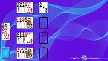 Game play consists of four, vertically arranged reserve piles of four cards each (one face-up card on top of three face-down cards). A seventeenth card is put in the first (top) of four foundations, which are also arranged vertically to the right of the reserve piles. Cards with the same suit as this card must be moved to this foundation. The other three foundations are also built by suit, but must begin with cards of the same rank as the first card of the top foundation (the 17th card previously mentioned). Foundation piles are fanned from left to right. All undealt cards make up the stock.