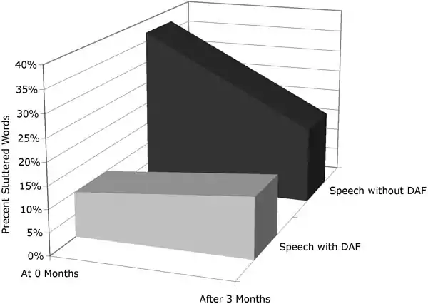 Three months later the subjects stuttered on 17% of words, when not using the DAF device. When wearing the DAF device they stuttered on 13% of words.