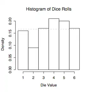 Referring back to what we would expect for an unbiased die, this is pretty close to what we would expect. So let's create a histogram to see if there is any significant difference in the distribution.