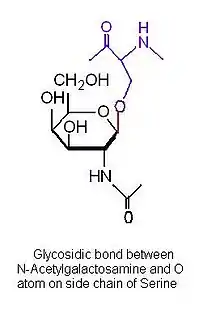 - O-linked Oligosaccharide: The most common O-glycosidic attachment involves the disaccharide core β-galactosyl-(1->3)-α-N-acetylgalactosamine linked to the OH group of either Ser or Thr. O-linked Oligosaccharides are synthesized in the Golgi apparatus by the serial addition of monnosaccharide units to a completed polypeptide chain. Synthesis starts with the transfer of GalNAc to a Ser and Thr residue on the polypeptide. N-linked oligosaccharides are transferred to an Asn in a specific amino acid sequence, but O-glycosulated Ser and Thr residues are not members of any common sequence. Instead, the locations of glycosylation sites are specified only by the secondary or tertiary structure of the polypeptide. O-glycosylation continues with stepwise addition of sugars by the corresponding glycosyltransferases.