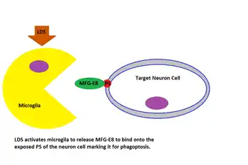 Destruction of neurons can be a serious potential health risk if the natural process goes amiss. The cells responsible for the phagocytosis of living neurons are microglia, which are brain cell macrophages. Microglia cells become activated by lipopolysaccharide (LPS) to consume and destroy inflamed neurons via phagocytosis. This activation of the microglia cells, in essence, makes them hunt for inflamed neurons by discharging MFG-E8, a binding protein. When living neurons become inflamed, they bare the phospholipid phosphatidylserine (PS) on the exterior surface of the cell. Once the PS is out in the open, MFG-E8 binds to PS marking it for the microglia to come engulf and destroy the neuron.[3]