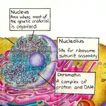 The nucleus is a membrane-enclosed organelle found in eukaryotic cells. It contains the genetic material of the cell, organized as multiple long linear DNA molecules that coil around to form chromosomes. The transcription of RNA also takes place in the nucleus.