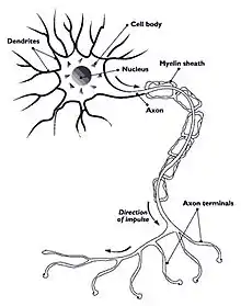 A human nerve cell is composed of various components: the soma, or cell body (which has a nucleus), the axon (by which nerve signals travel), the myelin sheath, which provides conductivity and allows electrical signals to travel through nerve cells, dendrites, which receive signals from other nerve cells, and axon terminals, which nerve cells use to communicate with each other via the release and binding of neurotransmitters.