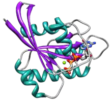 Ras is a guanosine-nucleotide-binding protein with 6 beta sheets and 5 alpha helices. Ras binds to a magnesium ion to help coordinate nucleotide binding. In other words, it is a G-protein, where the G comes from the guanosine in the protein. G proteins function have “on” and “off” states, and as might be expected they have different functions and properties in these two different states.