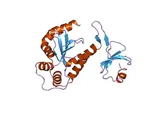 A disulfide bond, also called an S-S bond, or disulfide bridge, is a covalent bond derived from two thiol groups. In biochemistry, the terminology R-S-S-R connectivity is commonly used to describe the overall linkages. The most common way of creating this bond is by the oxidation of sulfhydryl groups. (2 RSH → RS-SR + 2 H+ + 2 e-) This process of oxidation can produce stable protein dimers, polymers, or complexes, in which the sulfide bonds can help in protein folding. The process mostly occurs with the thiol groups in cysteine. [1]