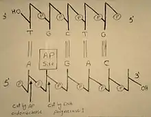 Since this site on the DNA duplex is without either purine base or a pyrimidine base is called an AP site (either apurinic or apyrimidinic). Then the enzyme AP endonuclease cut the bond on the 3' side of the phosphodiester bond of the nucleotide. In this phase DNA polymerase I recognizes phosphodiester bond at the 3'end on the next nucleotide unit and cleaves the bond. After the ribose-phosphate unit is removed, DNA polymerase I analyzes the complementary strand and finds that the base that corresponds to the AP site is guanine. Then the enzyme inserts a cytosine unit at the AP site on the broken DNA strand. Finally, DNA ligase seals the inserted cytosine into the damaged strand. Spontaneously deamination of cytosine to form uracil can be repaired by the cell. [1]
