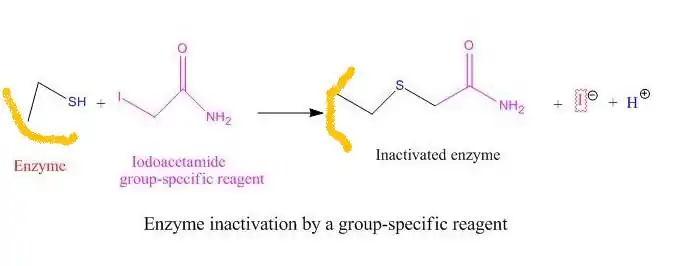 Group specific reagents are enzyme inhibitors that can covalently bond to a particular amino acid residue on the enzyme and irreversibly modify it.It is less specific compared with affinity label and suicide inhibitor. It reacts with side chain of amino acid.