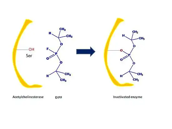 - Group specific reagents react with specific amino acid side chains like diisopropylphosphofluoridate (DIPF) and iodoacetamide. For example, only 1 of the 28 serine residues in chymotrypsin is modified by DIPF. This means that this specific residue is especially reactive; moreover, it is implied that this specific residue lies in the active site of the enzyme chymotrypsin. DIPF has also provided data that suggests, through its binding with active serine residues, that there is indeed a reactive serine residue contained within the active site of the enzyme Acetylcholinesterase. The inactivating functionality of DIPF and similarly-shaped molecules in acetylcholinesterase is representative of a group of compounds, known as nerve agents.