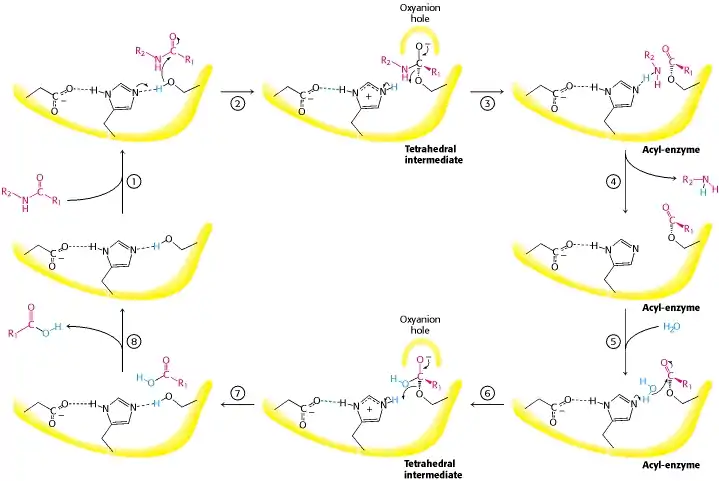 Step 5: A water molecule is added where the N terminus was. Histidine deprotonates the water to form a hydroxyl group. This hydroxyl group attaches to carbon from the carboxyl side and destabilizes the acyl intermediate. The bond is broken.