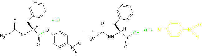 Because chymotrypsin can also catalyze the hydrolysis of esters and amides, p-nitrophenolacetate was used in conjunction with chymotrypsin. The reaction with p-nitrophenolacetate will yield p-nitrophenol, a chromic-effector with a yellow color change in the product. The absorbency can be determined from the color and the intensity can determine the amount of product. Hartley and Kilby used this information in 1954 to show that the reaction proceeds in two phases: a Burst Phase and then levels off to a steady-state phase. Thus, there is a formation of a covalently bound enzyme substrate intermediate.
