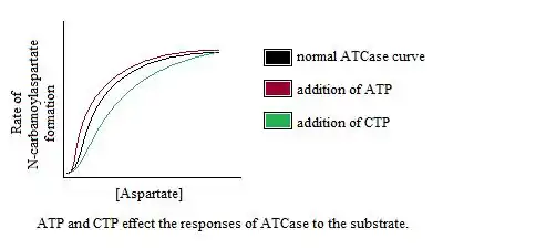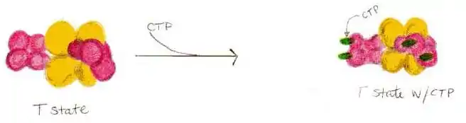 CTP is not the only NMP molecule that has an effect on ATCase, ATP also has its own effect. Whereas CTP stabilizes the T state ATP stabilizes the R state of ATCase. Stabilizing the R state of ATCase allows the substrate to bind easier and in turn the reaction rate is increased.