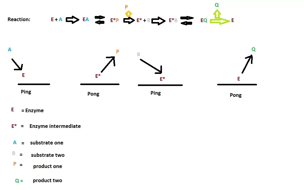 The name pingpong reaction came for the substrates appearing to bounce on and off the enzyme to a pingpong ball in the Cleland notation.