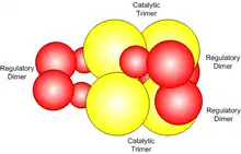 ATCase is made of six regulatory subunits and six catalytic subunits. The 3 regulatory subunits (r) are dimers made of 2 chains of 17 kd each. The smaller of the two, the regulatory subunit can bind to CTP and thus shows no catalytic activity. The 2 catalytic subunits (c) are trimers consisting of 3 chains, each 34 kd. The catalytic subunit is unresponsive to CTP thus does not follow a sigmoidal behavior.