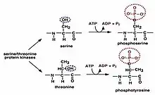 ATP must be present for phosphorylation because it is needed as a donor. One of the phosphoryl groups of ATP is transferred to a specific amino acid. The acceptor is one of three amino acids with a hydroxyl group as a side chain: serine, threonine, and tyrosine. Tyrosine is handled by a different protein kinase than the other two. The reaction below shows how ATP donates one of the phosphoryl groups to a phosphorylated protein.