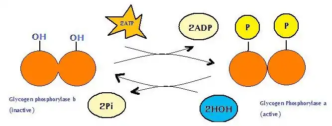 Phosphorylase activity is regulated by reversible phosphorylation. Phosphorylase a is the active form, while phosphorylase b is inactive.