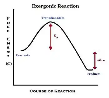 However, some exergonic reactions do not occur spontaneously and require a small input of energy to start the reaction. This input of energy is called activation energy. Once the activation energy requirement is fulfilled by an outside source, the reaction proceeds to break bonds and form new bonds and energy is released as the reaction takes place. This results in a net gain in energy in the surrounding system, and a net loss in energy from the reaction system; hence, the change in Gibbs free energy (ΔG)] is negative (ΔG < 0). A negative ΔG denotes that the reaction is spontaneous and thermodynamically favorable.