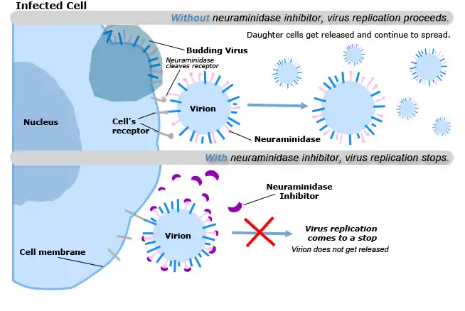The spread of the flu virus is slowed in the body by the following steps: (1) The virus enters a cell with neuraminidase inhibitors present. (2) Once inside the cell, the neuraminidase inhibitors attach to the virus. (3) The flu virus can still use its host to replicate itself. (4) However, the inhibitors prevent the virus from leaving the cell—which halts the infection of other cells. (5)The virus is rendered ineffective and dies within the cell.