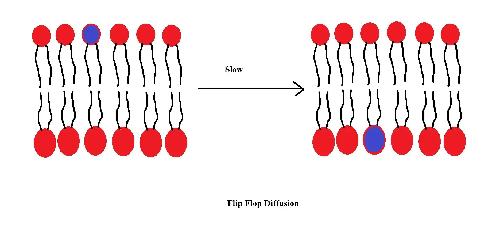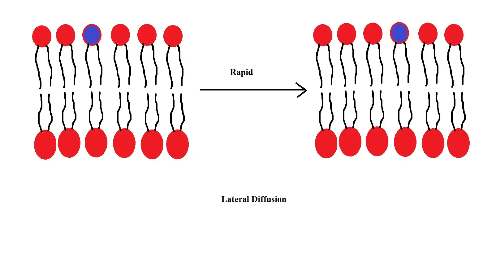 Membranes are not static sheets of molecules locked in place but rather, they are held together by hydrophobic interactions which are much weaker than covalent bonds. As a result, most of the lipids and some of the proteins can diffuse laterally across the membrane. Adjacent phospholipids switch positions about 10^7 times per second where as molecules flip-flopping transversely across the member is rarely observed. The reason flip-flopping is rarely observed is because switching from one phospholipid bilayer to another requires the hydrophillic part of the molecule crossing the hydrophobic core of the membrane. Proteins on the other hand do drift laterally but at a much slower pace as their size, compared to lipids, is relatively large. Two factors increase the fluidity of membranes. The first factor is the presence of unsaturated hydrocarbon tails of phospholipids which have kinks that keep the molecules from packing closely together. The second factor is the presence of cholesterol which enhances fluidity at low temperatures by hindering solidification by disrupting the regular packing of phospholipids. What also enhancs the fluidity of lipids is the lateral (fast) and flip flop (slow) exchange of place of lipid molecules between each other.