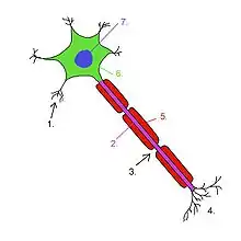 All the brain and nervous system are based on communication among nerve cells, known as neurons. Each neuron is like any other cell in the body. Each neuron is surrounded by a membrane and filled with liquid and has a nucleus containing its genetic material. Neurons are specialized to receive and transmit information. All of the neurons gather information either from other cells of the body or from the environment. They transmit information to other neurons and/or other kinds of cells. A typical neuron has an enlarged area, which is the cell body. The cell body contains the nucleus. Neurons have branches or nerve fibers. The branches on which information is received are known as dendrites. The dendrites are a branched structure that receives signals from other cells. Each neuron has a longer tail-like structure, or axon. The axon transmits information to other cells. Axons can be branched at the tips. The axons of many kinds of neurons are surrounded by a fatty, segmented covering called the myelin sheath. The covering acts as a kind of insulation and improves the ability of axons to carry nervous system signals rapidly. A single neuron may be capable of receiving messages simultaneously on its dendrites and cell body from several thousand different cells. Most neurons usually have a soma, dendrites, axons, and a terminal button. The soma is the cell body of the neuron, and it contains the nucleus and is responsible for many of the processes of the cell.