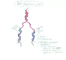 When DNA is being replicated, it forms a replication fork that was created during the helicase process that separates the DNA strand. The strands that are separated are called the leading strand and the lagging strand accordingly. The leading strand is synthesized in the 5'-3' direction. It is the new DNA strand, which is being synethized by DNA polymerase. The lagging strand, on the other hand, at the opposite side, which runs from 3' to 5' direction and are synthesized by okazaki fragments. Then primase will build up RNA primers, allowing DNA polymerases to use the 3' OH groups on the RNA primers to act on the DNA running from 5' to 3'. Then these RNA fragments are being substituted with new deoxyribonucleotides and the strand will then be joined together with DNA ligase to complete the chain.