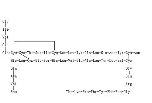 Insulin is a hormone consisting of 2 polypeptide chains. Each chain is composed of a specific sequence of amino acid residues connected by peptide bonds. In humans, chain A has 21 amino acids, and chain B has 30. Post translational modifications result in the connection of these two chains by disulfide bridges. Cysteine residues on A7 and B7, as well as A20 to B19 are covalently connected by disulfide bridges. Chain A also has an internal disulfide bridge connecting A6 to A11. The 3D structure of insulin is composed of 3 helices and the three disulfide bridges. Hydrophobic amino acid residues are clustered on the inside of the molecule while the polar amino acids residues are located on the outer surface. This arrangement of amino acid residues lends stability to the overall molecule. A single molecule of insulin can form a dimer with another insulin molecule, but the most active form is a single unit. The chemical formula for the insulin monomer is: C256H381N65O79S6.