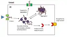 Processes in Conflict During Protein Folding: After the protein enters the ER, the proteins break up into an ensemble of folding intermediates. These intermediates take three different routes. They are either folded properly and sent to be exported out of the endoplasmic reticulum (ER) into the cytosol, aggregated or picked out for degradation. These three processes are in competition to properly secrete a protein. In order for a protein to be properly secreted, the competition between folding, aggregation and degradation must be in favor of folding, so that folding occurs faster than the other processes. This balance is termed proteostasis. The balance of proteostasis can be tipped in favor of folding by either using smaller molecules to stabilize the protein (called co-factors) or increasing the concentrations of folding factors. This ability to control proteostasis allows scientists the power to overcome some of the protein folding diseases such as cystic fibrosis.
