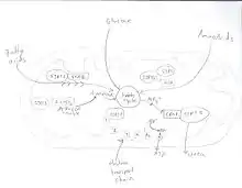 The insulin receptor is activated when the α-subunit wraps around insulin. When the α-subunit closes around insulin, it causes the β-subunits in the intracellular side to come together. When the two ‘arms’ of the β-subunits come to close proximity, the intrinsic tyrosine kinase becomes active. The tyrosine residues on the β-subunit become phosphorylated, causing a dramatic conformational change on the intracellular end of the receptor. Phosphorylating tyrosine on the receptor also serve to generate docking sites for other substrates, such as insulin-receptor substrates (IRS). Upon docking, the tyrosine residues on IRS are phosphorylated by the receptor. In this form, IRS works as an adapter protein, where IRS binds to lipid kinases and moves them to the membrane. The lipid kinase phosphorylates phosphoinositol bisphosphate to generate phosphatidylinositol trisphosphate. This phosphorylated lipid then activates a protein kinase PDK1, which then also activates another protein kinase: Akt. All of the kinases mentioned above are either anchored to the receptor or the membrane, except for Akt. Akt can move across the cell and cause the movement of glucose transporter GLUT4 to the cell membrane. Once at the membrane, GLUT4 can transport glucose from the extracellular environment into the cell.