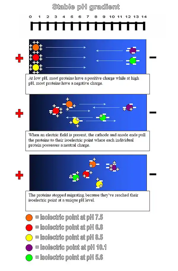 Isoelectric point, also called the pI of the protein, is the pH at which the net charge of the protein is zero. Isoelectric focusing is a separation technique which separates peptides according to their isoelectric point, or how acidic and basic their residues are. A gel with a pH gradient is used as the medium. The pH gradient is made by adding polyampholytes, which are multi-charged polymers, with different pI into the gel. Then the sample is put onto the gel and a voltage is applied. The proteins will move along the gel until they reach their isoelectric points. In other words, each protein will move until it reaches a position in the gel at which the pH is equal to the pI of the protein. a protein band that forms at a given pH can then be removed and analyzed further. This process can successfully separate proteins that have a difference in net charge greater than or equal to 1.