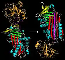 The first serpins that were studied, antitrypsin and antithrombin, showed that all serpins have a distinct fold which allows them to fit inside other proteins and inhibit their functions. Serpins are composed of three β-sheets (referred to as A, B and C), about nine α-helices, and an open region (known as the center loop) which is the site of reaction. The center loop, known as RCL, is the reaction site which initiates inhibition processes and does not always appear on the same area for all serpines. The difference of where the RCL is situated distinguishes each serpine from the next.