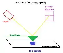 Atomic force microscopy is a technique used to image the ultrastructural alteration in the TEC such as the change in bend angles of the template DNA induced by RNAP. The TEC is placed on a flat surface then scanned with a AFM cantilever which is a beam anchored at one end. Then, deflections are detected by a laser that reflects the surface. This allows the reconstruction of two-dimensional image of transcriptional complex.