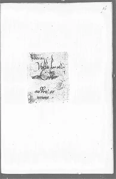 6. This is an excerpt from binding papers. It is an elaborate script, but smudged and hard to decipher: "Wlbe lyned / nl owe" Slogan: "Nowe or / neuer."