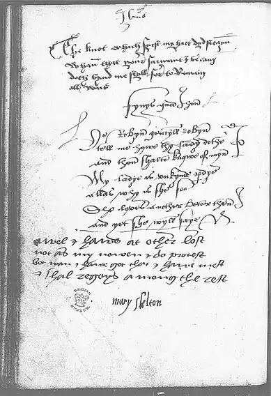 Attributed to Sir Thomas Wyatt,[1] this poem was entered by H10. This poem is a seven-line excerpt of a twenty-six line poem that seems to have been written last on the page between an excerpt by H3 above and a possibly original poem by Mary Shelton below. H3 enters a complete and slightly different version of the poem on 24r-24v as "Hey Robyn loly Robyn tell me." Rebholz observes that this poem may be an expansion of a popular song: a slightly different version of the first three stanzas appears in Henry VIII's song-book[2] and Feste sings another version of the poem in Shakespeare's Twelfth Night (IV, 2, 78-9).[3]