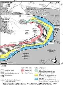 Plate tectonics theory which predict the presence of an accretionary wedge, composed of distal sediments scraped from the ocean floor at the inner side of the arc. At this place, however, de Smet (1999) found continental basement rocks and Early Mesozoic continental sediments. The situation is explained as the result of an inversion process of the Australian continental margin during the Neogene plate collision between Australia and the Banda subduction zone. De Smet (1999) concludes that the Outer Banda Arc is not an accretionary complex, but instead the compressed northern rim of the Australian continent. The load of Australian continental margin sediments that accumulated during the Mesozoic and Tertiary is pushed up on the back of crustal blocks of continental basement to form the present islands and mountains of the Outer Banda Arc.